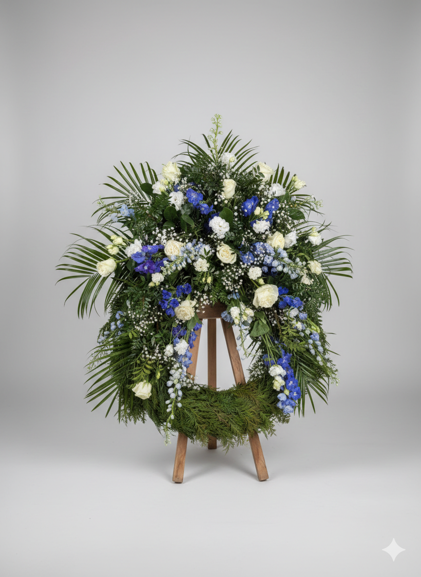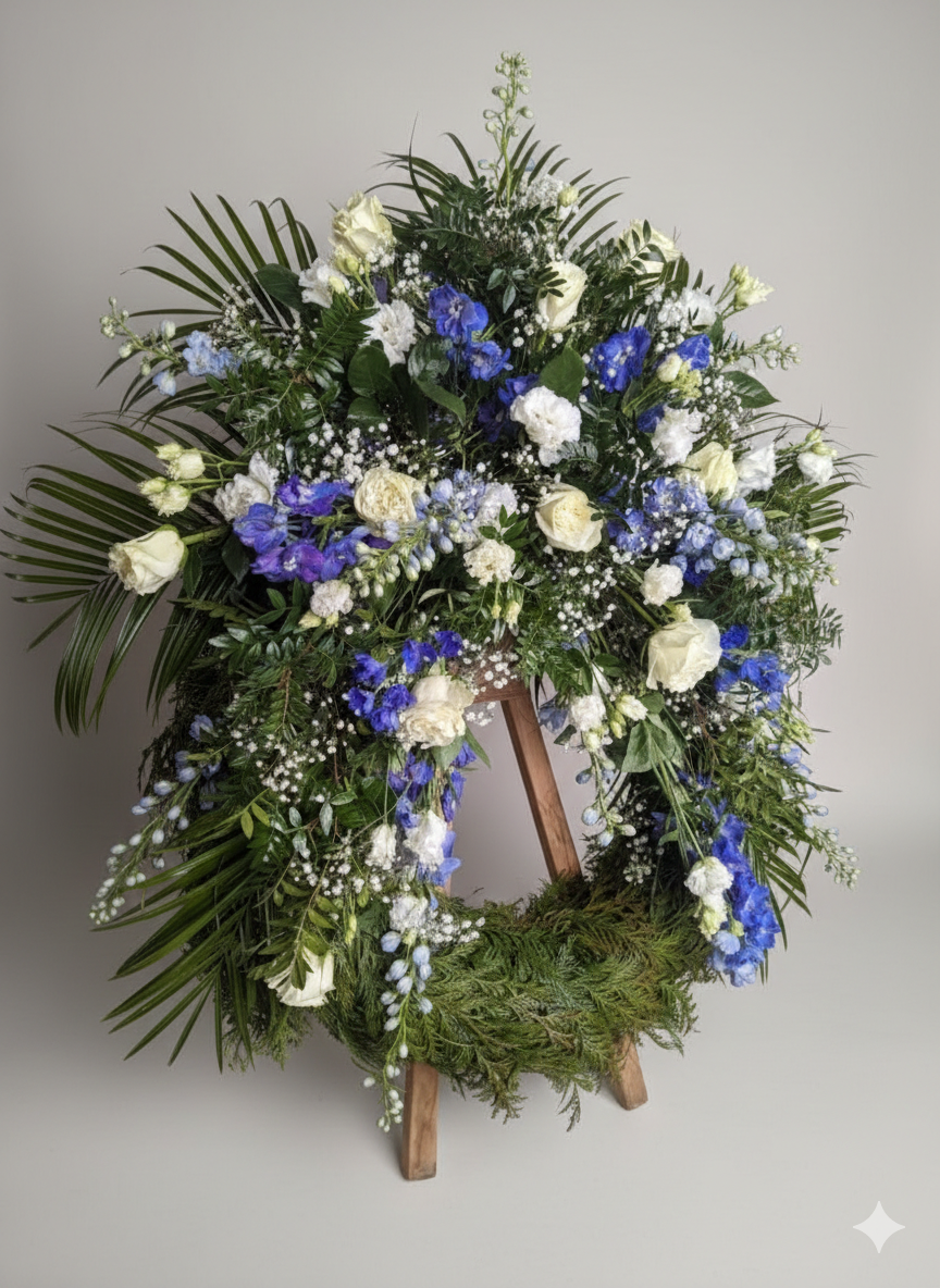 Smuteční věnec Heaven s rozvozem. Vyjádřete svou hlubokou soustrast a úctu posledním sbohem, které nese symboliku klidu a naděje. Tento bohatě zdobený smuteční věnec je vázán z čerstvých květin v harmonické modro bílé kombinaci, která působí velmi ušlechtile a decentně.